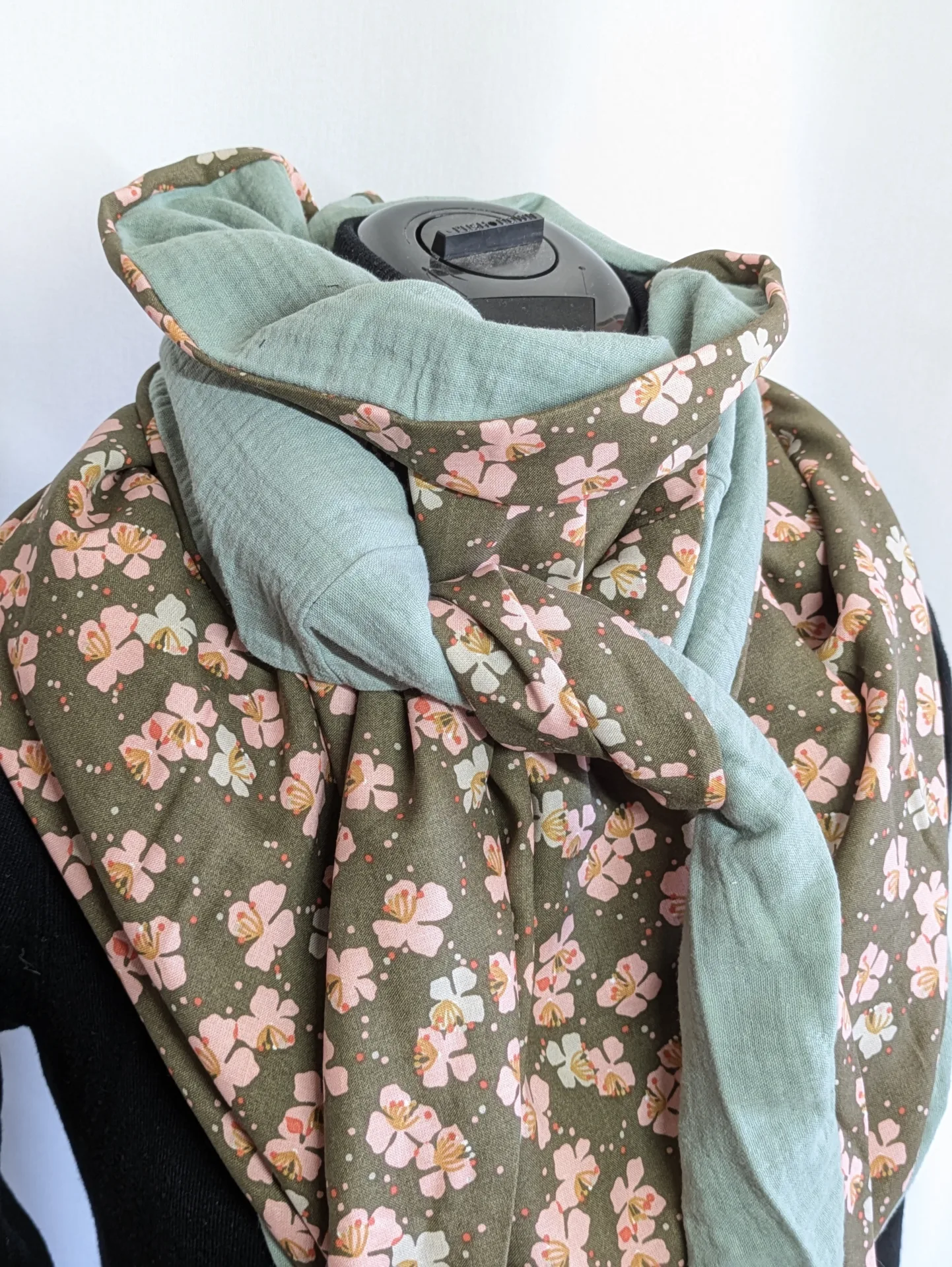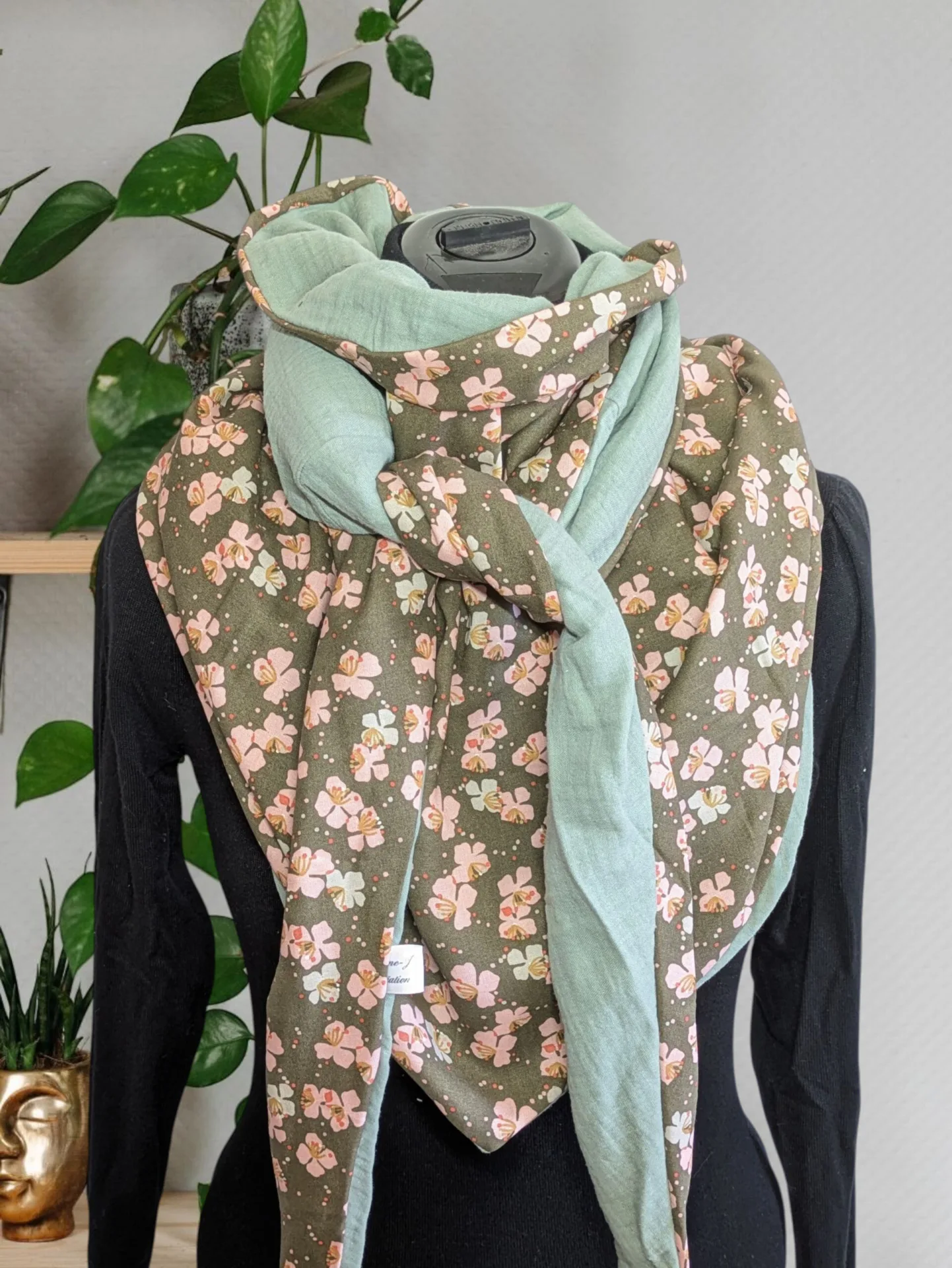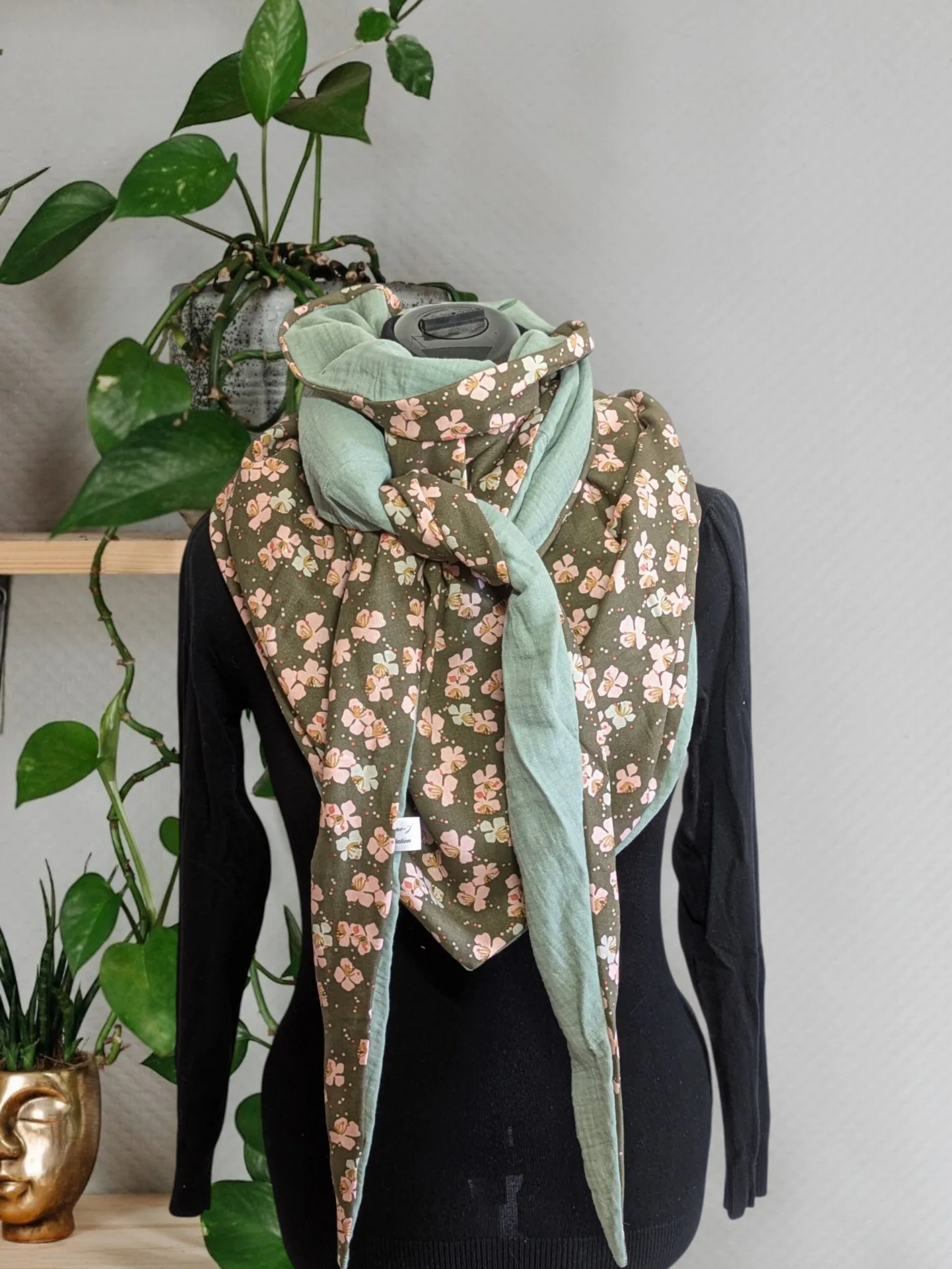 *Cette écharpe est confectionnée en coton imprimé ton rose avec un double gaze terracotta.