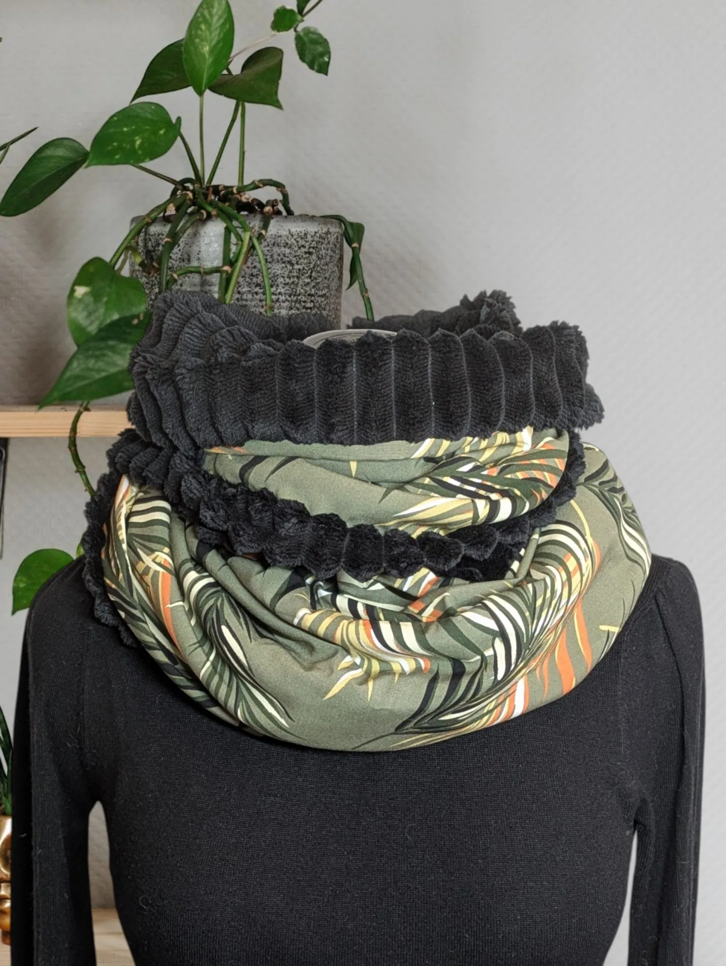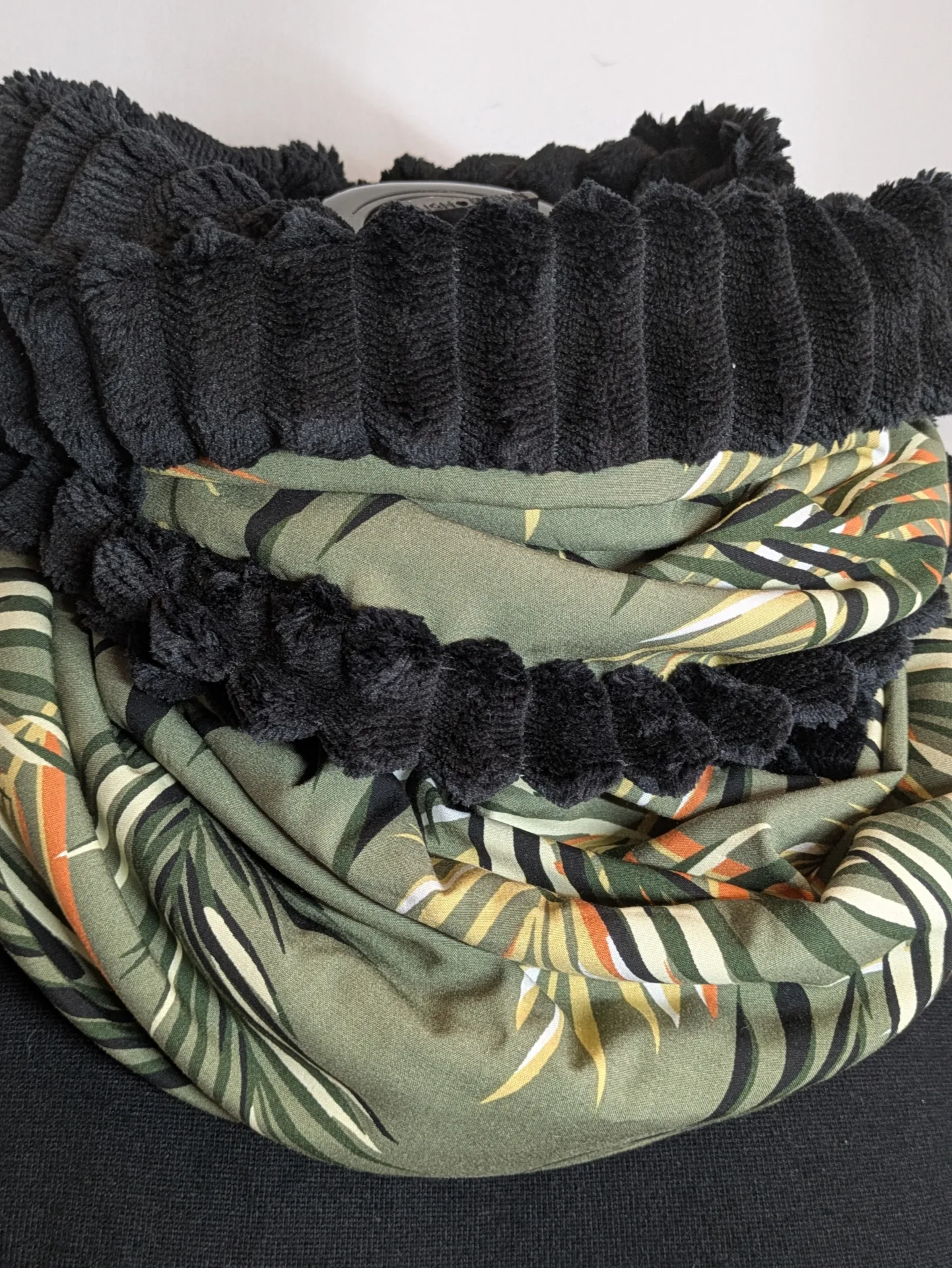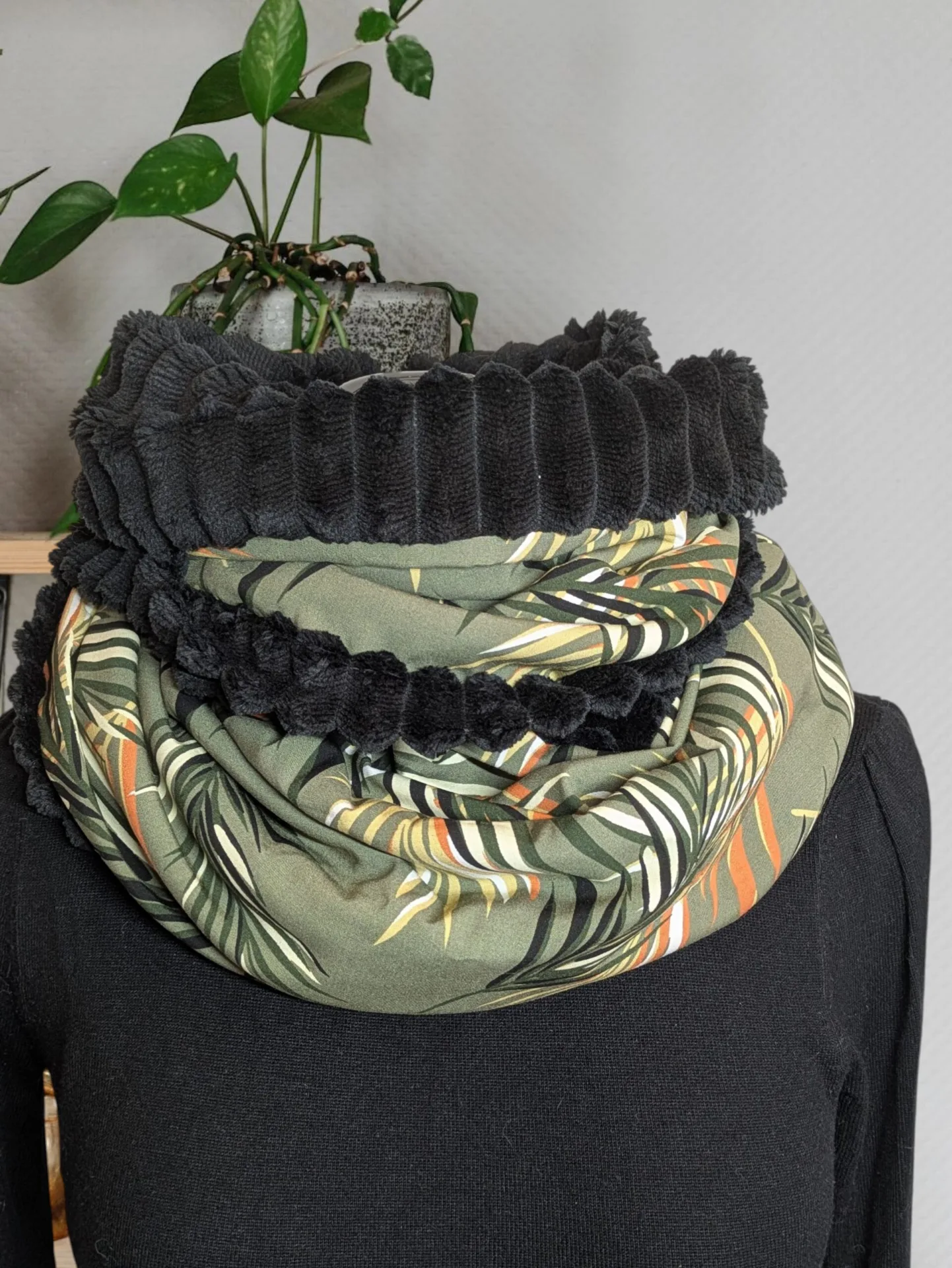 – Tissu : viscose feuillage fond vert et minky côtelé noir.