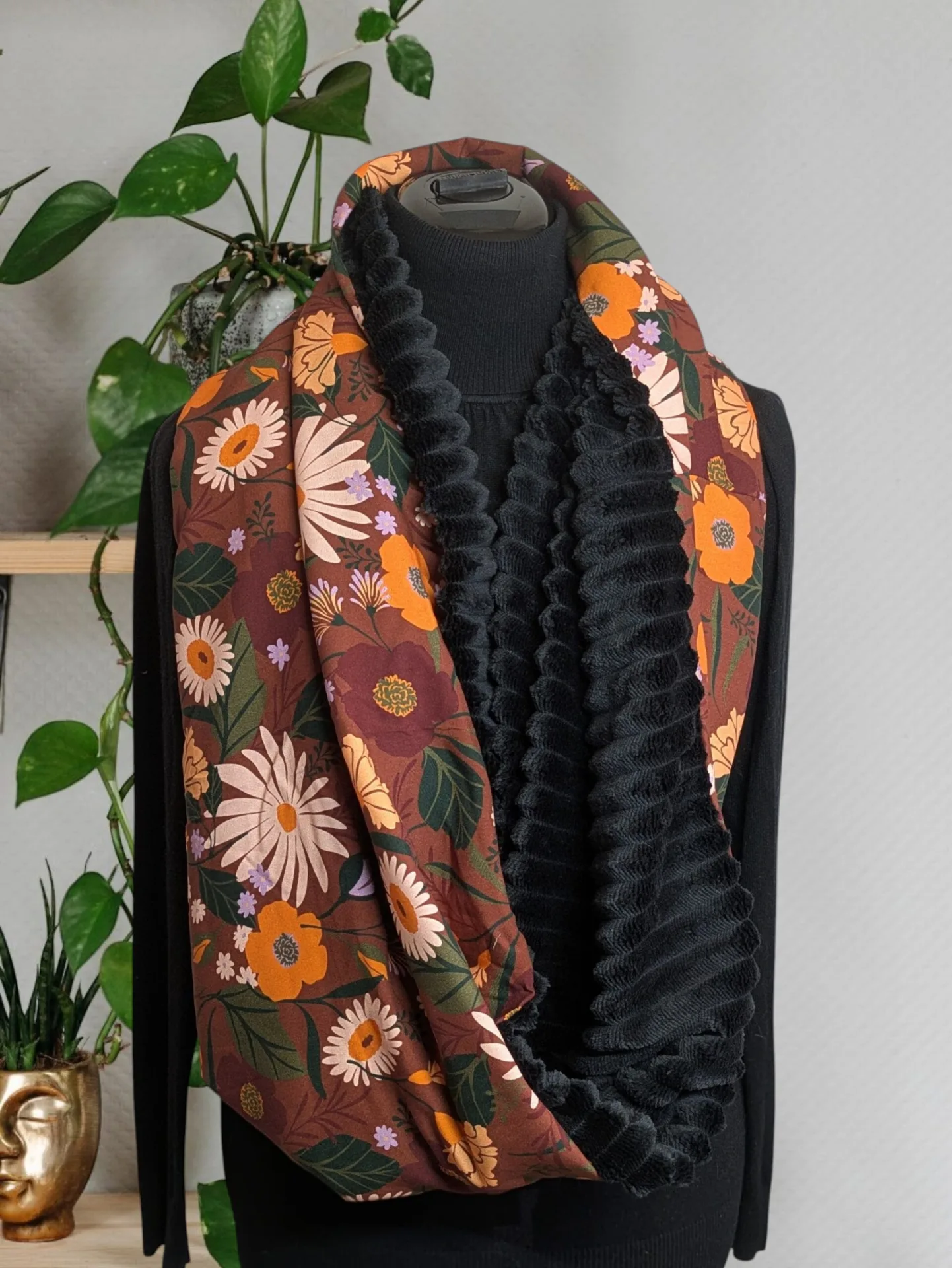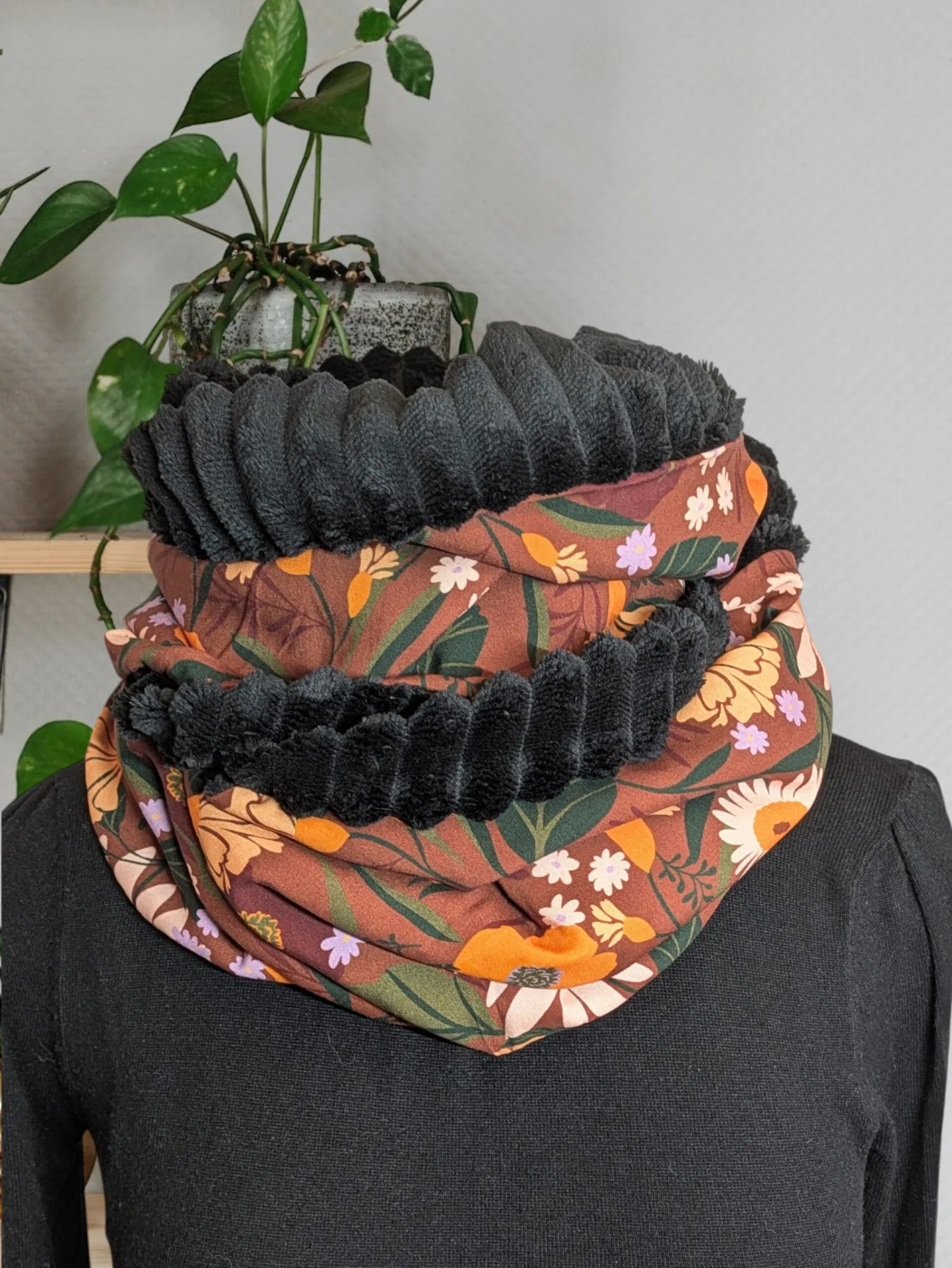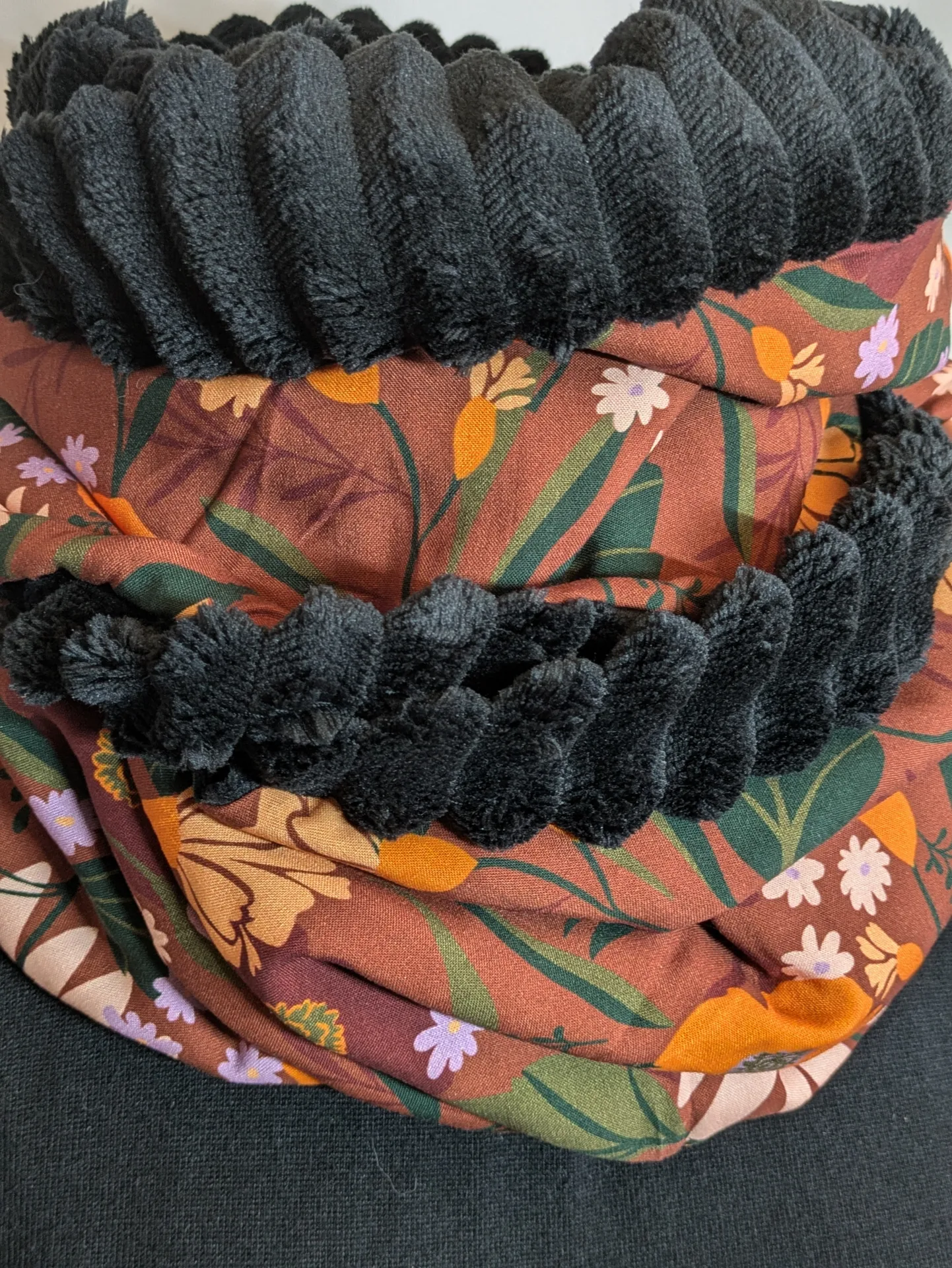 – Tissu : viscose fleuri fond terracotta et minky côtelé noir.
