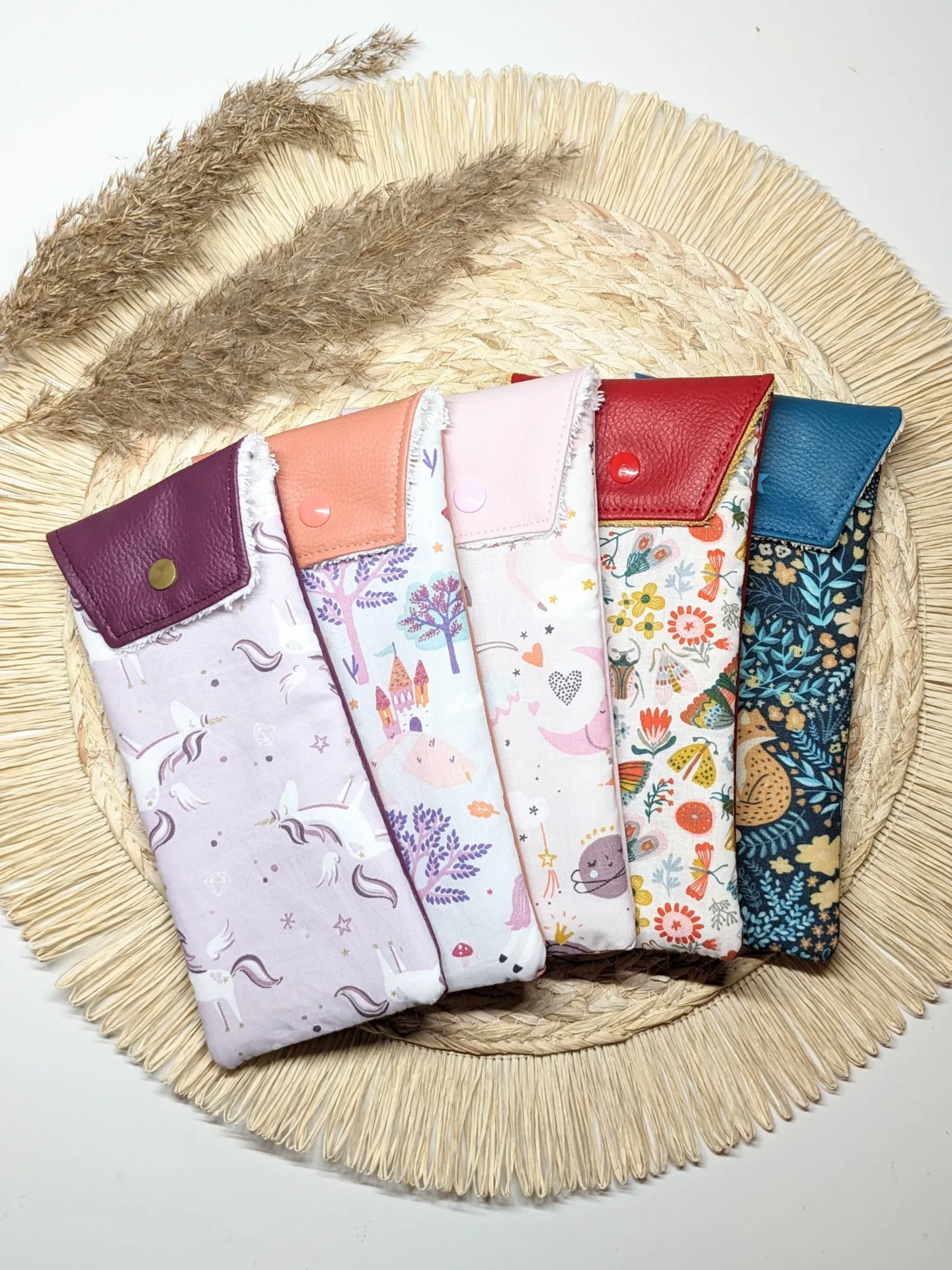 Marron-Biche, Rouge-Géométrie, Rose-Sirène, Bleu-Jungle, Rouge-Fleurs, Rouge-Papillon, Rose-Danseuse, Pêche-Princesse, Prune-Licorne, Bleu-Renard