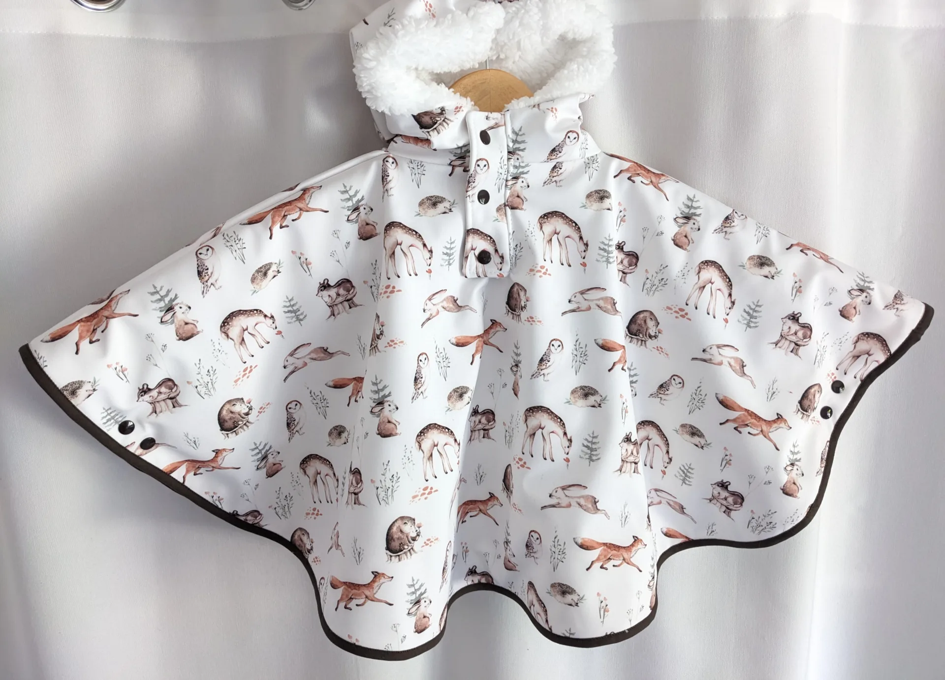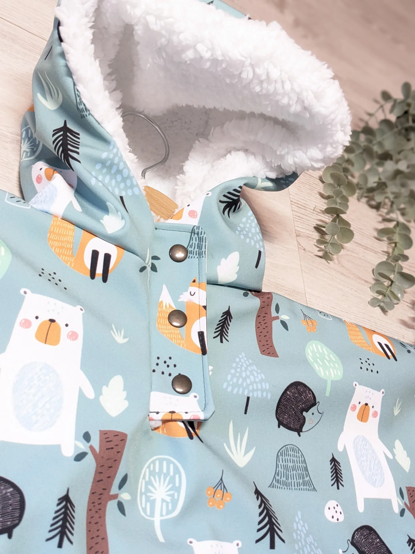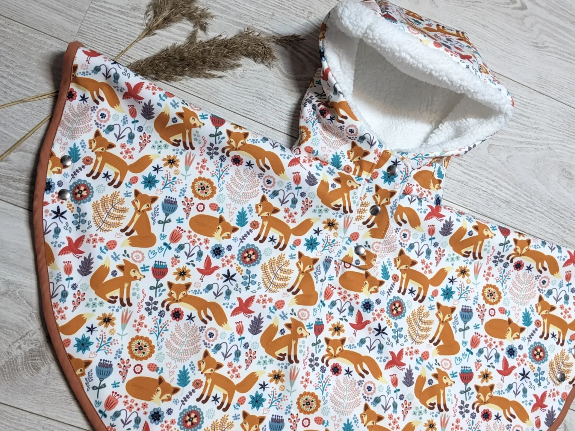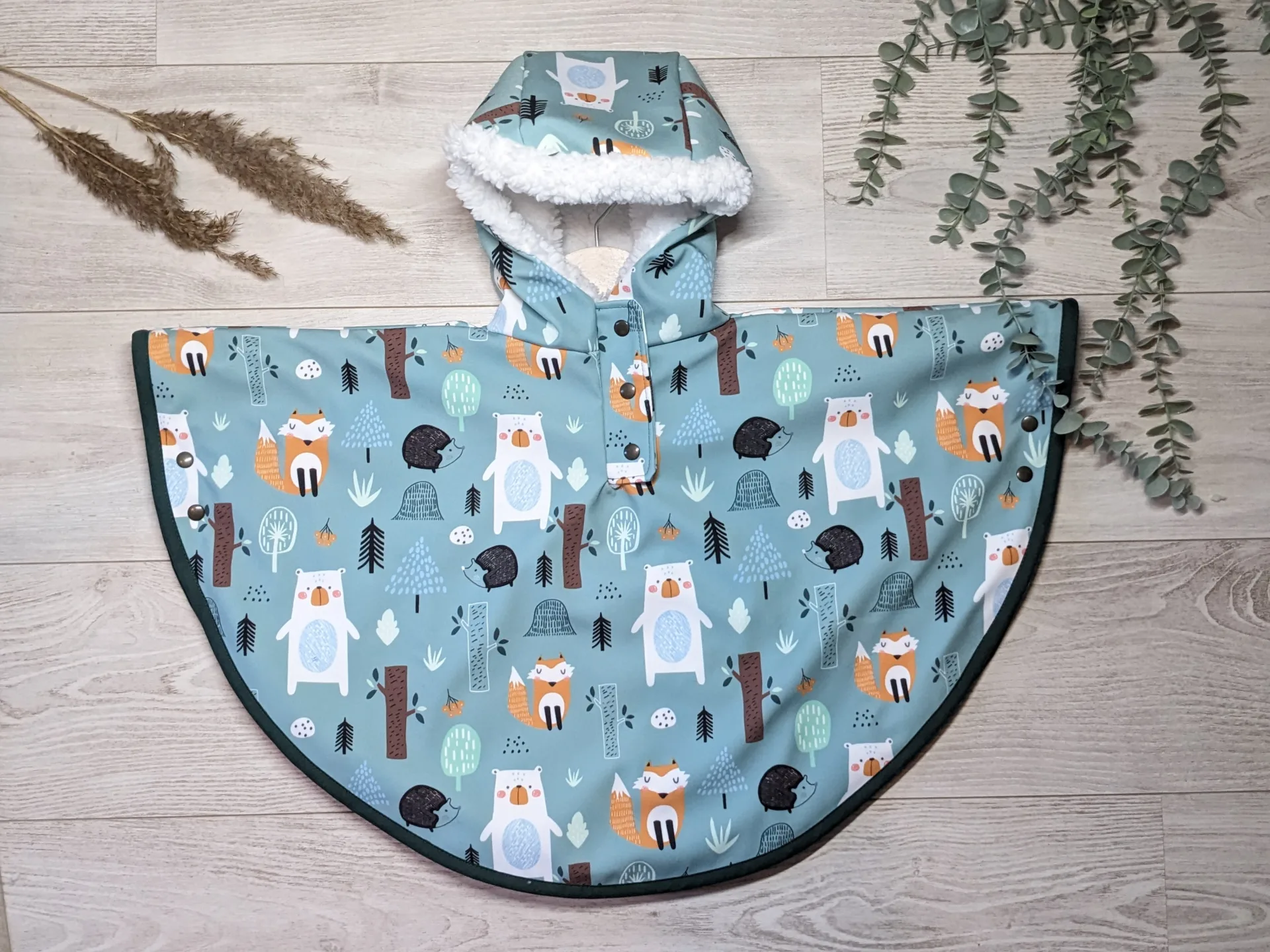 *Cette cape de pluie est constituée d’une face en softshell imprimé imperméable que vous pouvez choisir parmi une sélection de tissu, et d’une face intérieure en fausse fourrure de mouton , connue pour tenir bien chaud (mais ne passe pas au linge sec ).