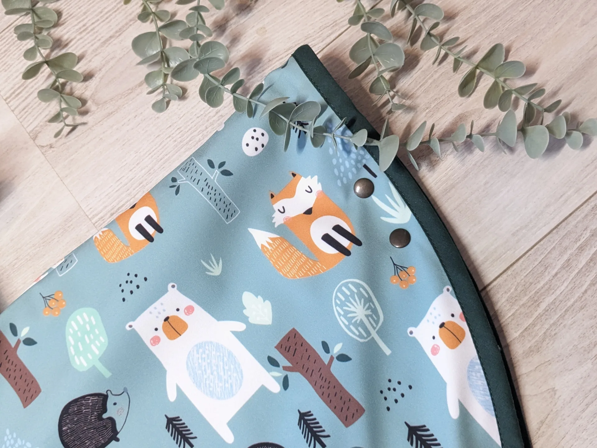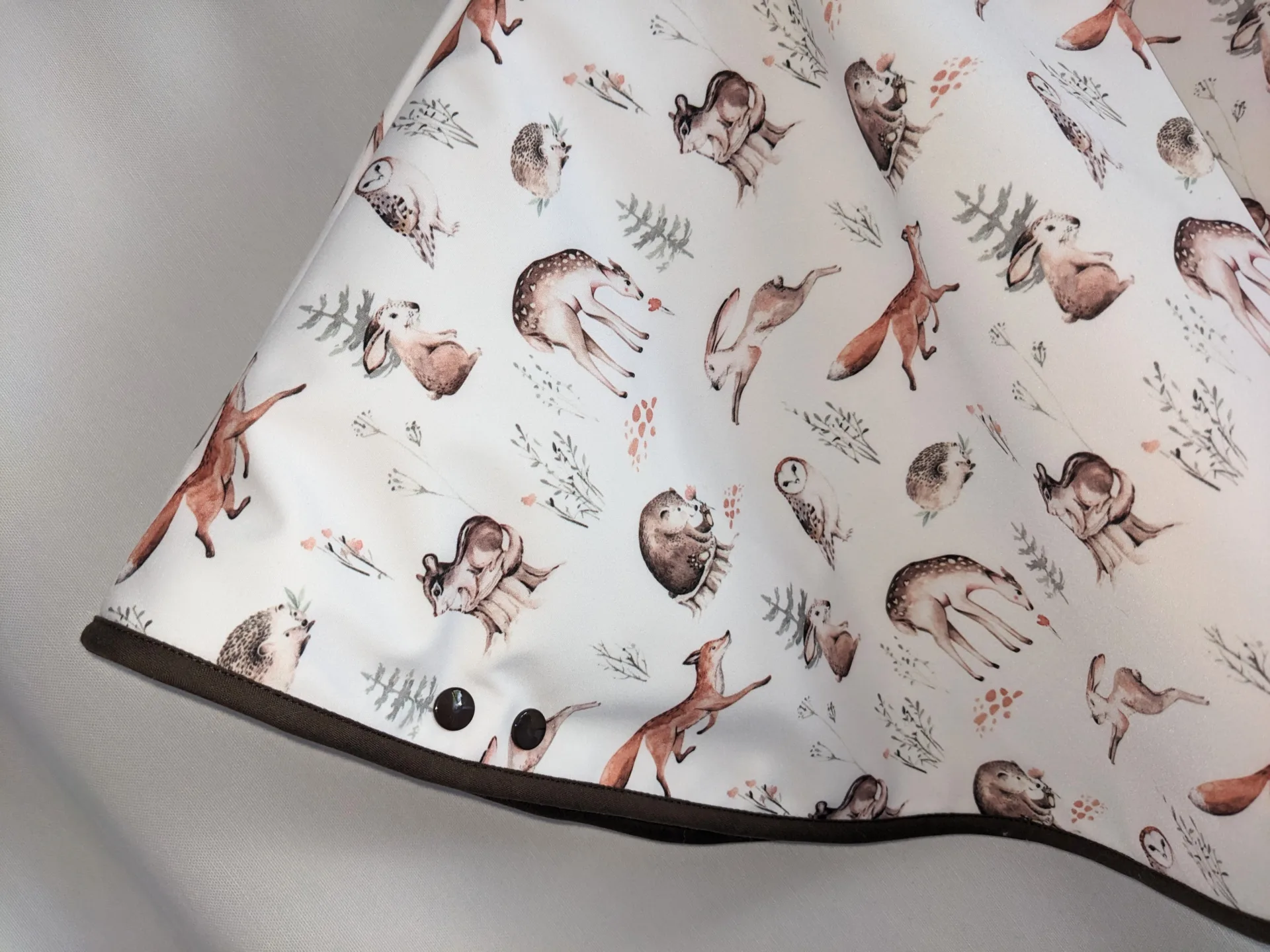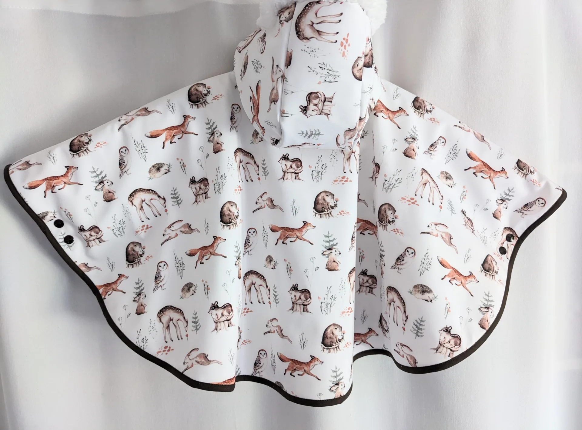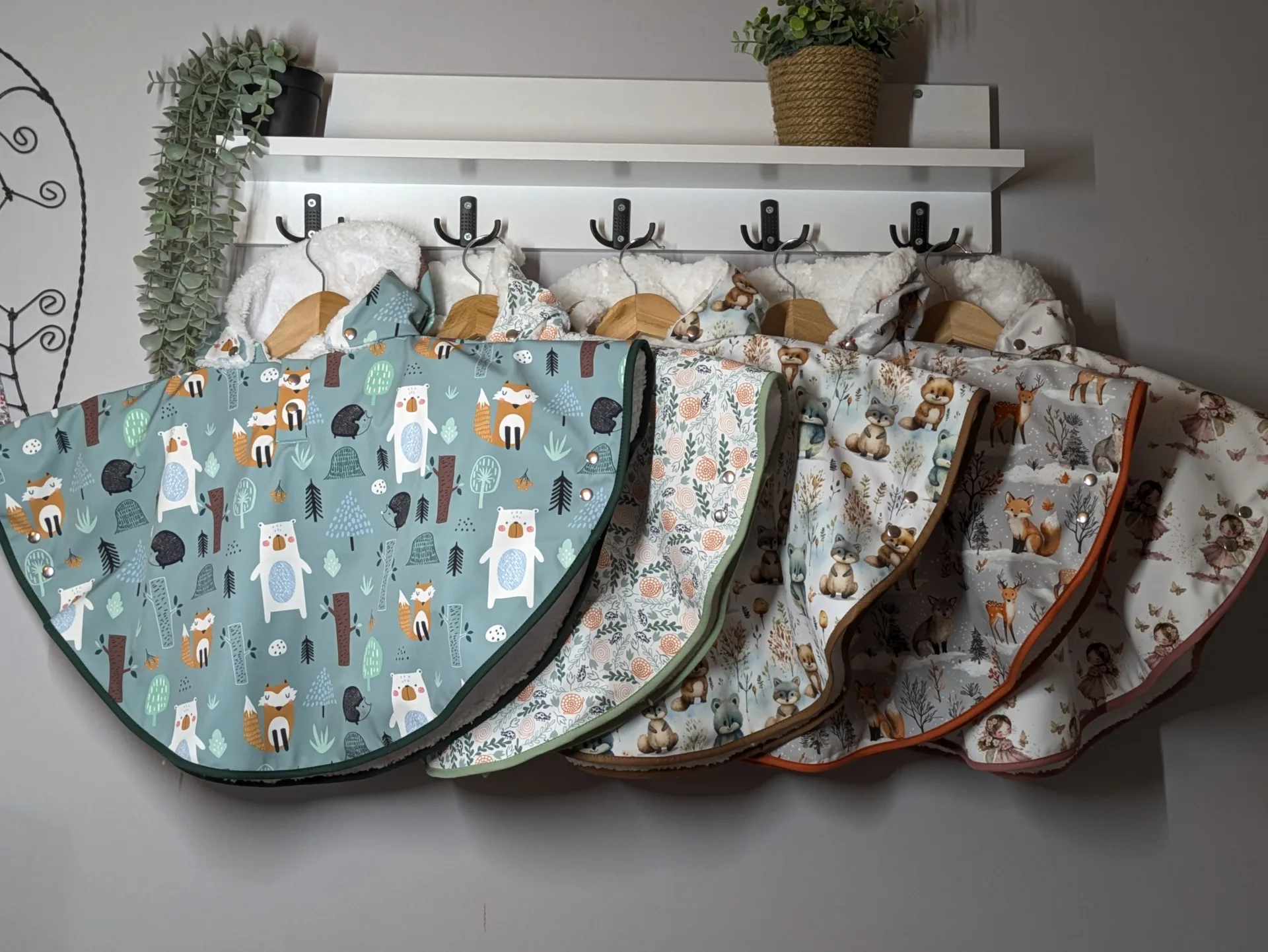 *Cette cape de pluie est constituée d’une face en softshell imprimé imperméable que vous pouvez choisir parmi une sélection de tissu, et d’une face intérieure en fausse fourrure de mouton , connue pour tenir bien chaud (mais ne passe pas au linge sec ).