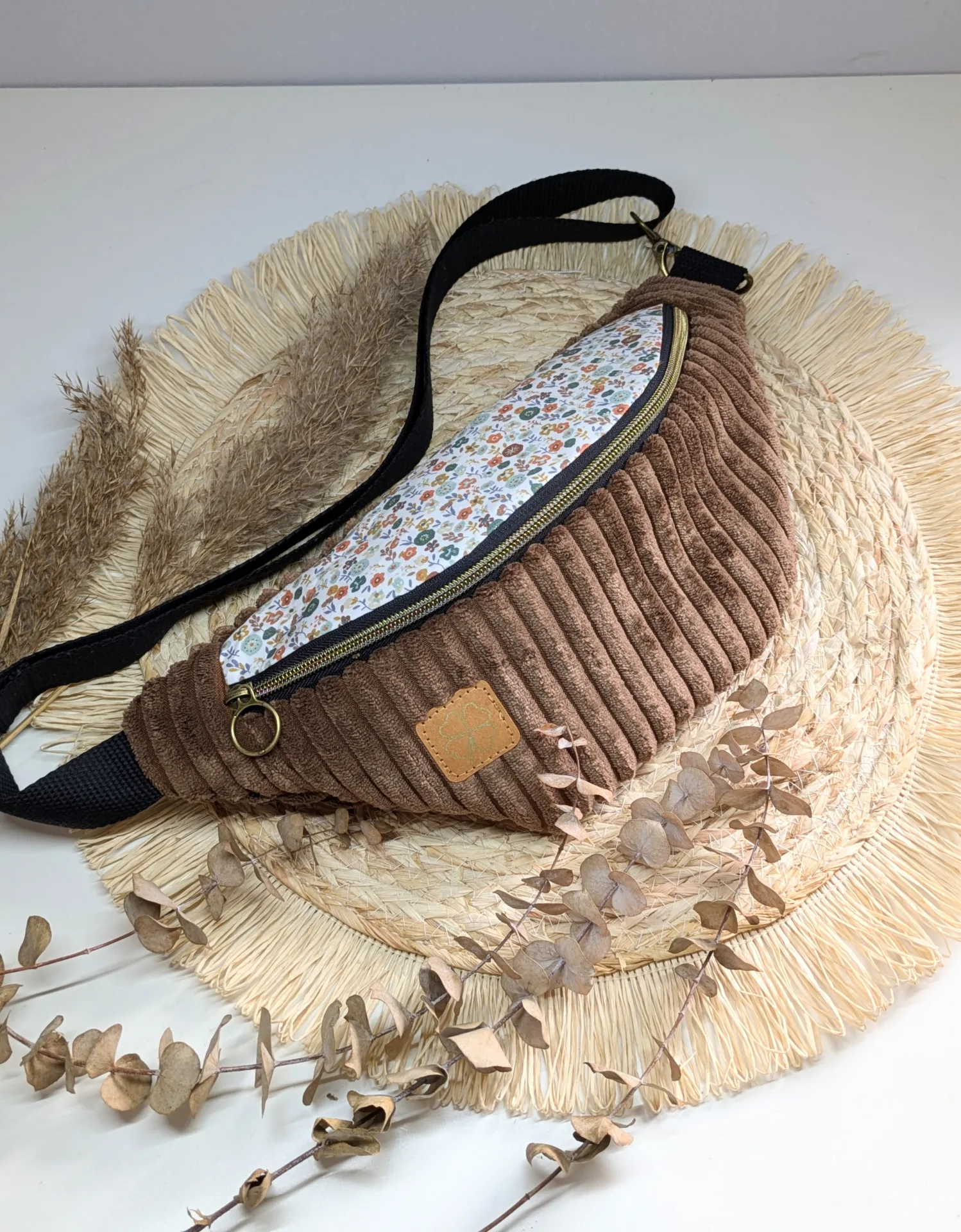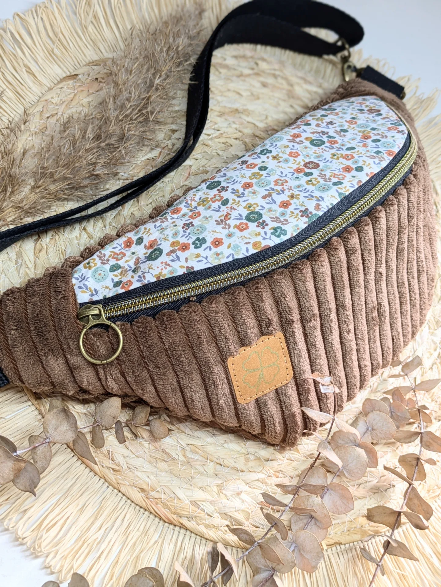 Design : Le sac présente un mélange élégant de velours côtelé marron et de tissu à fleurs d’automne, apportant un contraste subtil et raffiné.