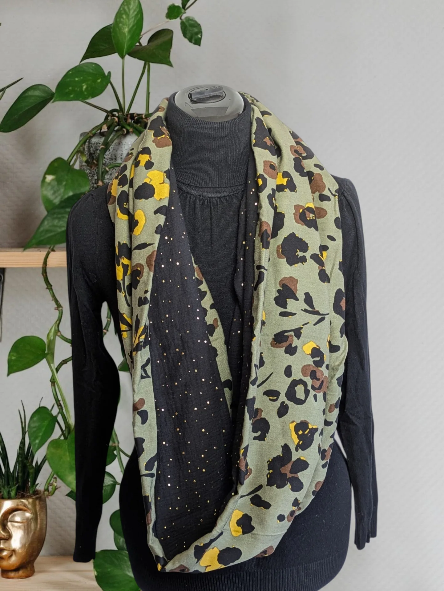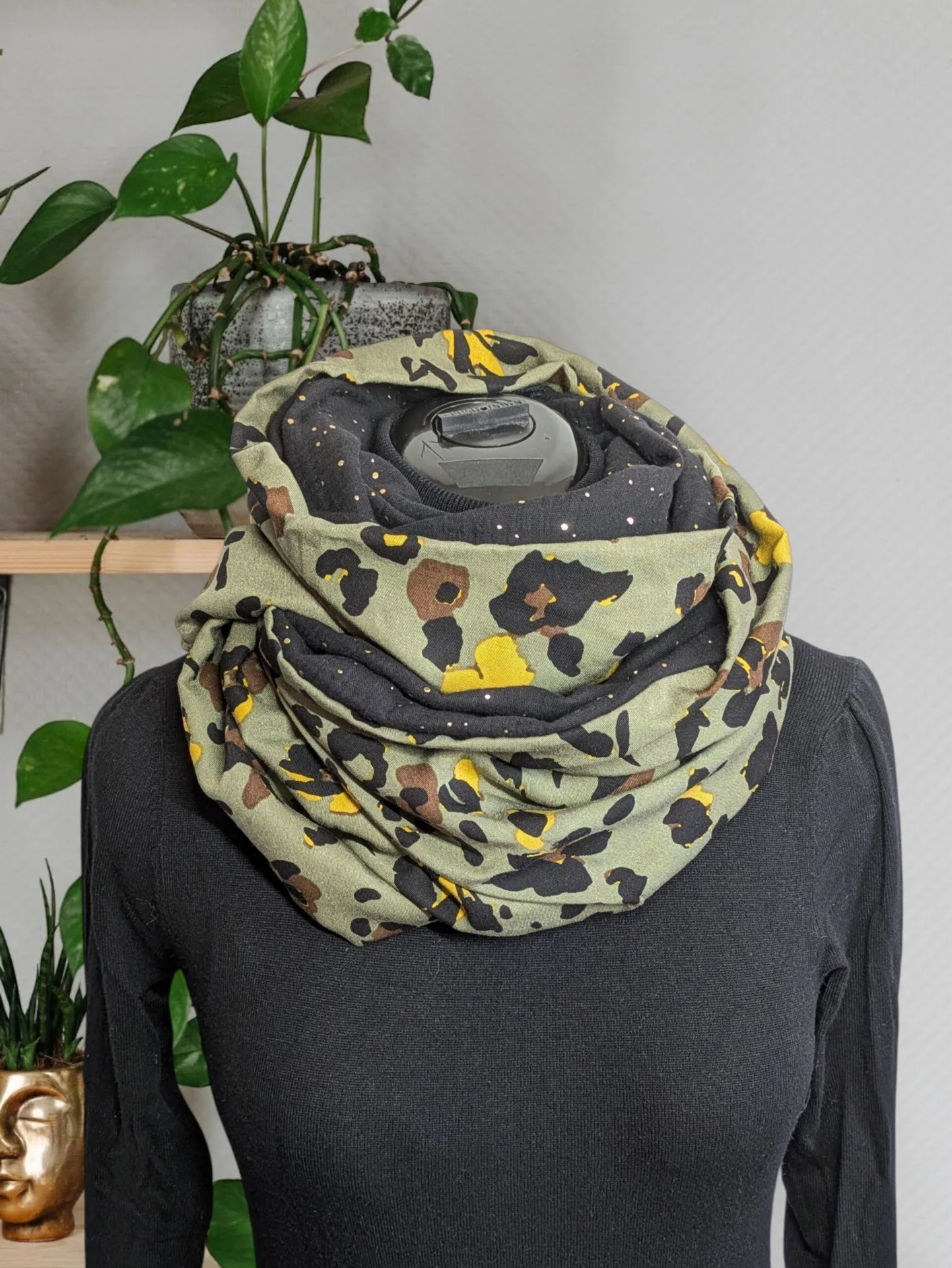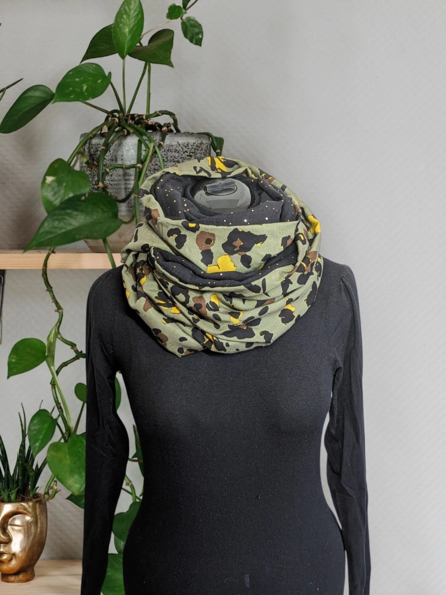 • Ce joli tour de cou se compose d’une viscose imprimé et une double gaze à pois or. Tissus certifiés oeko-tex sans substance nocive.
