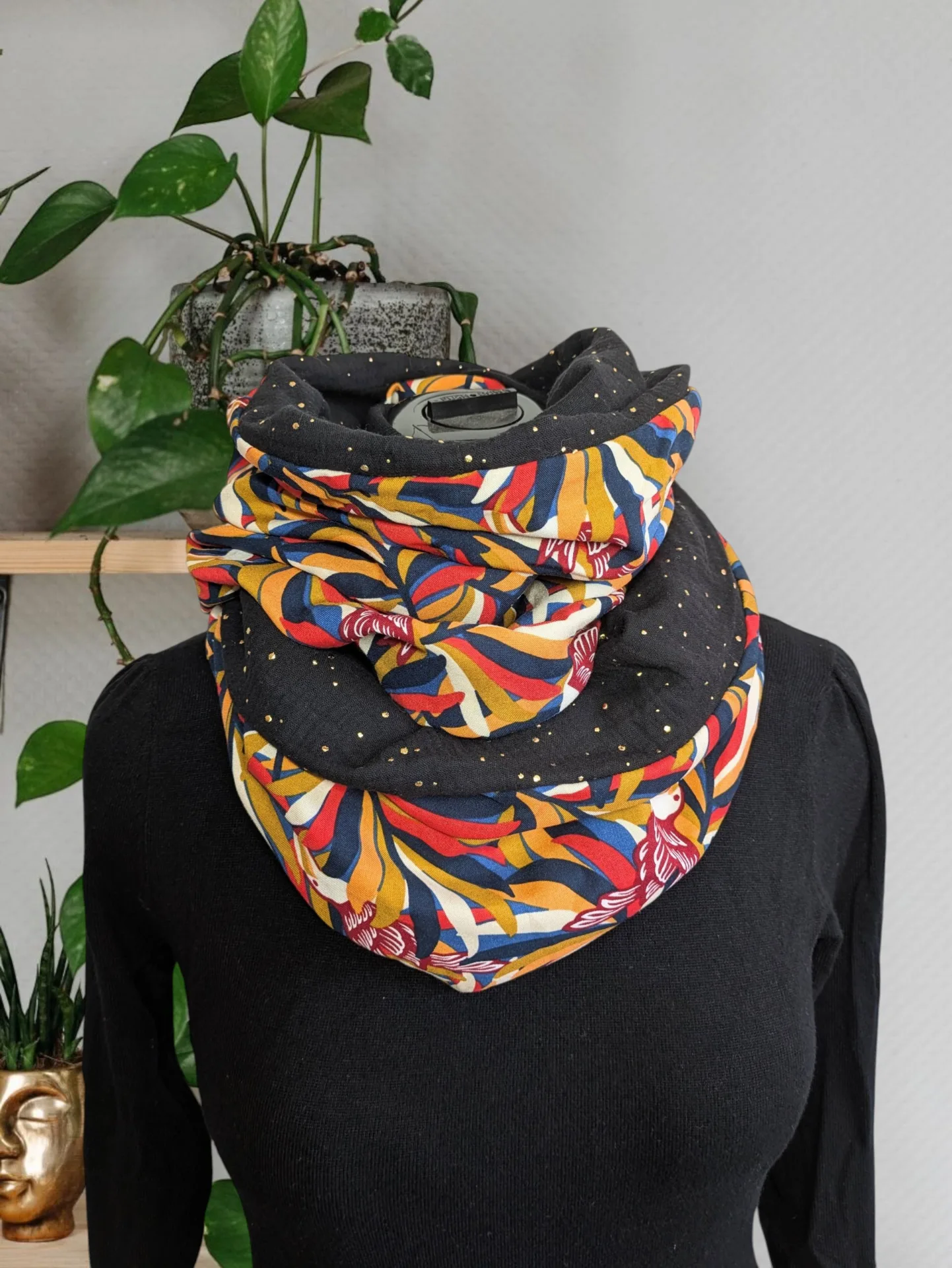 - Ce joli tour de cou se compose d’une viscose imprimé et une double gaze à pois or. Tissus certifiés oeko-tex sans substance nocive.
