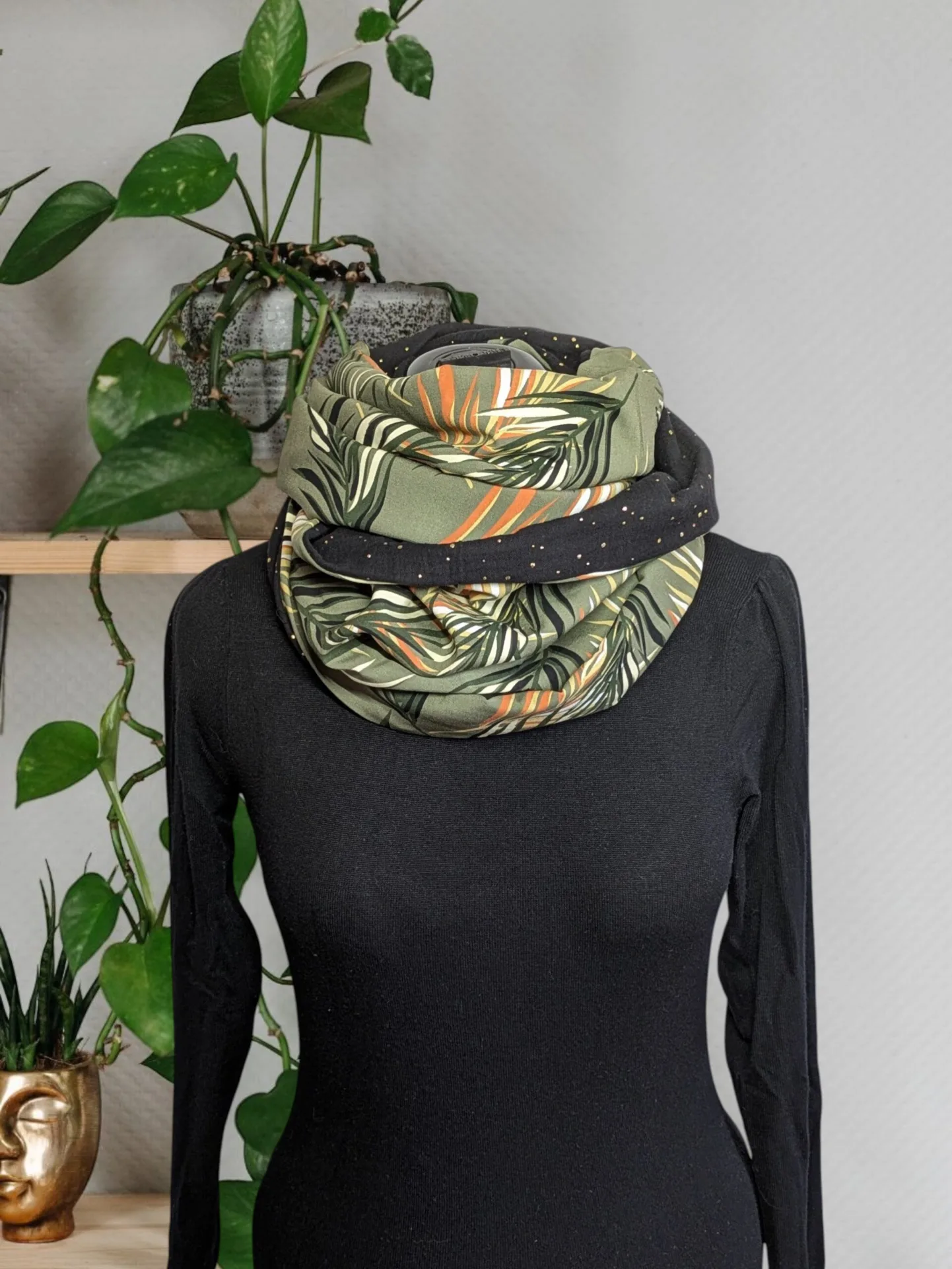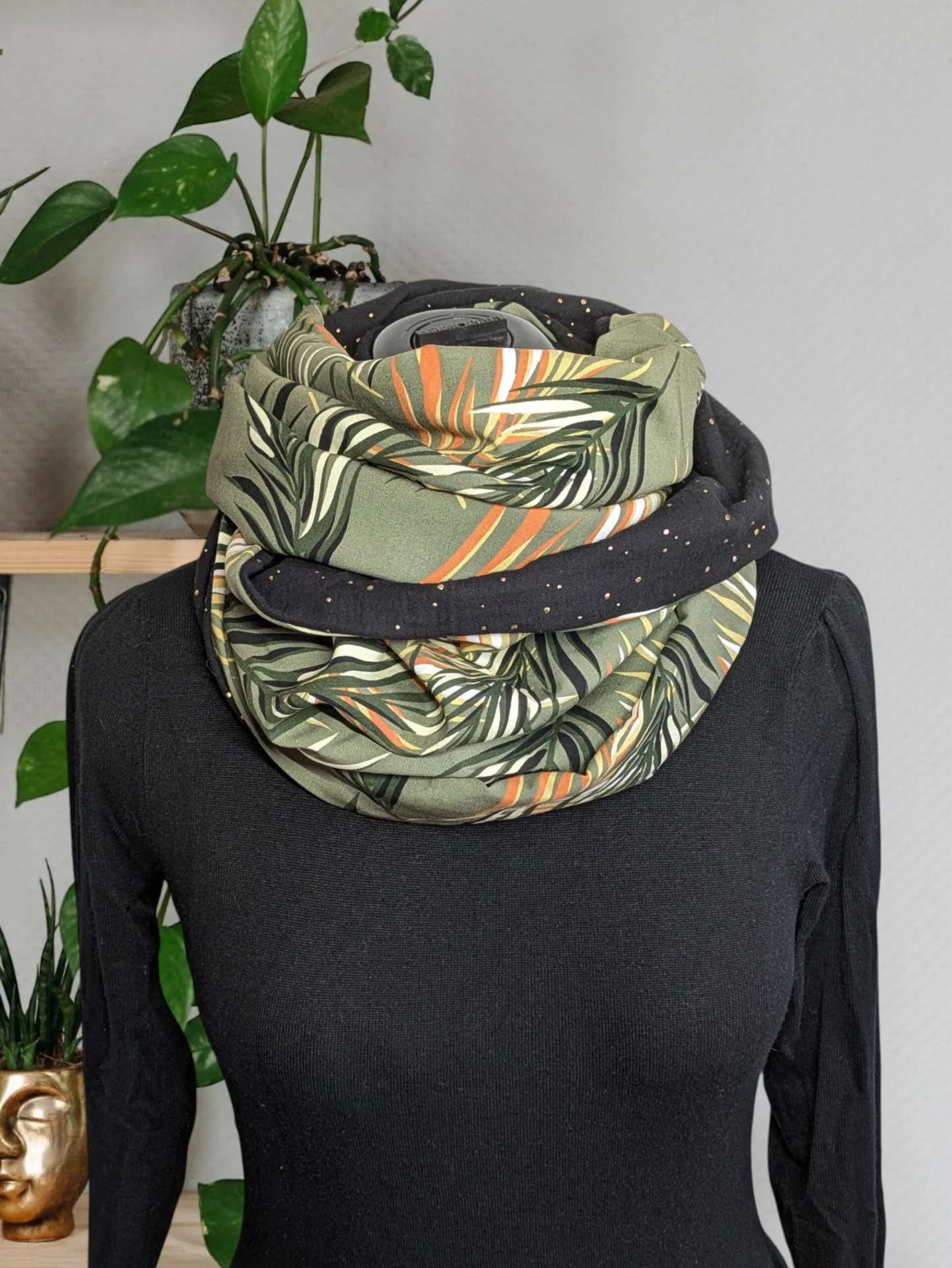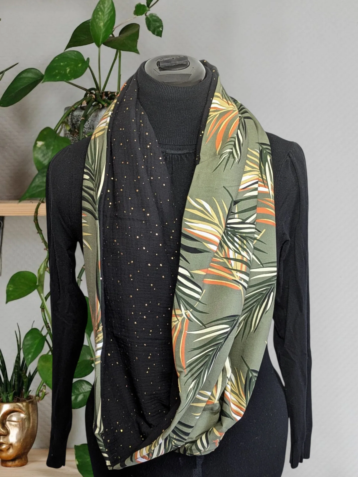 - Ce joli tour de cou se compose d’une viscose imprimé et une double gaze à pois or. Tissus certifiés oeko-tex sans substance nocive.
